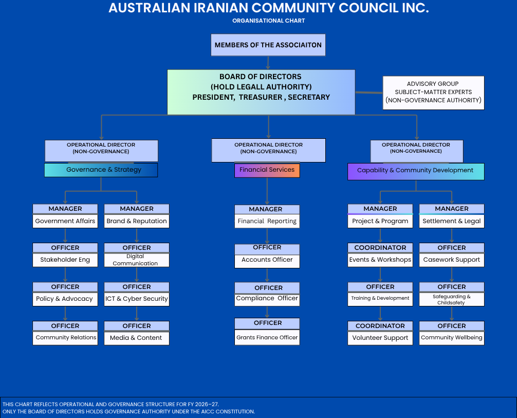 The Australian Iranian Community Council (AICC) is committed to transparent and accountable governance. In line with the AICC Constitution, approved by the Queensland Office of Fair Trading, we maintain a clear and accessible Organisational Chart that outlines our governance structure, reporting lines, and key areas of responsibility. This chart reflects our commitment to clarity, integrity, and effective leadership by showing how our Management Committee, Advisory Group, and operational functions work together to support our mission. By making our organisational structure publicly available, we reinforce our dedication to openness, good governance, and the trust placed in us by our members and the broader community.